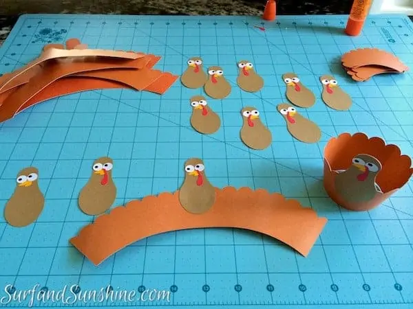 I decided last minute that I wanted to take my Hershey S’Mores Cupcakes to the next level and turn them into turkeys. I opened up my Silhouette software and browsed the online store and came across these cute Turkey Cupcake Wrappers – on sale even!