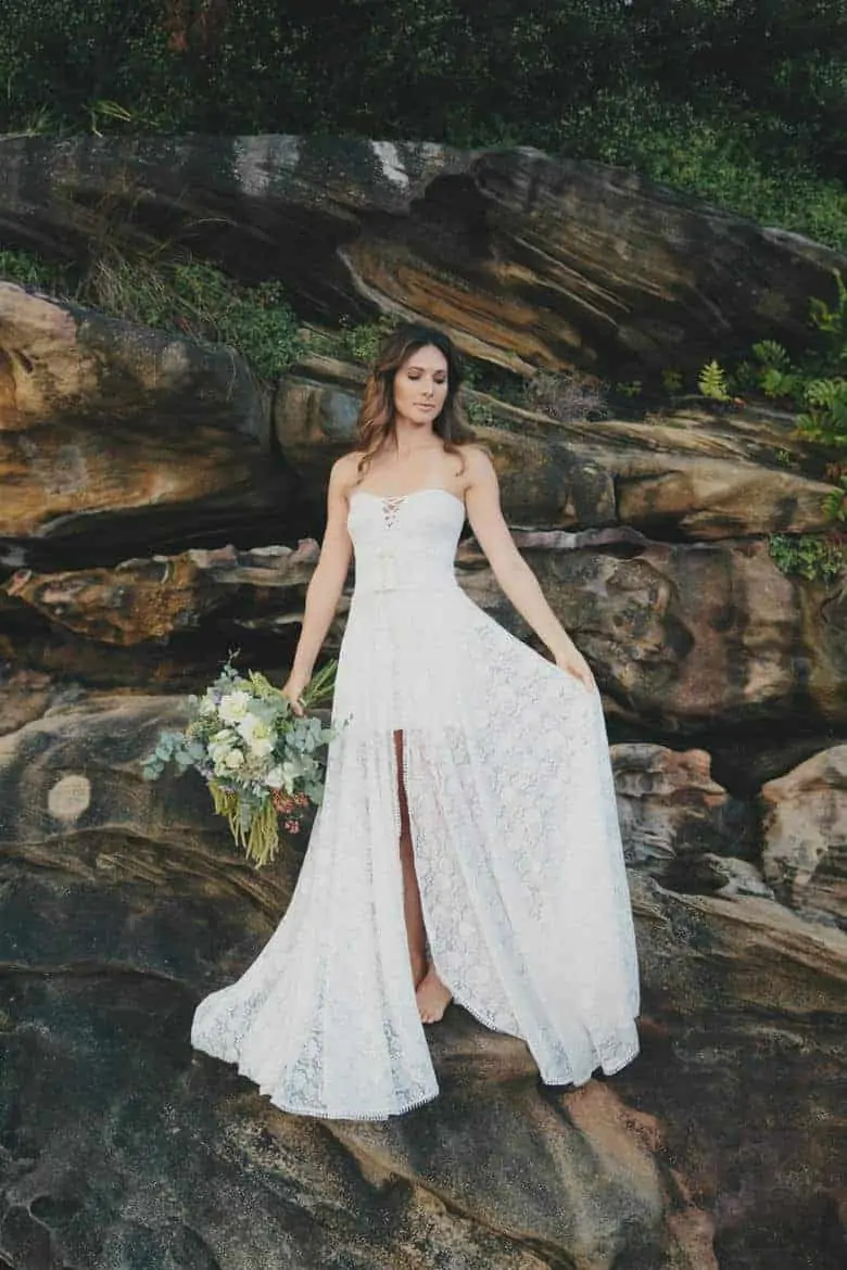 Lace is always a great classic vibe like this hi-lo cut dress from Beach Bridal Bliss. It combines just the right amount of beach, sexy, and fun for a sandy wedding.