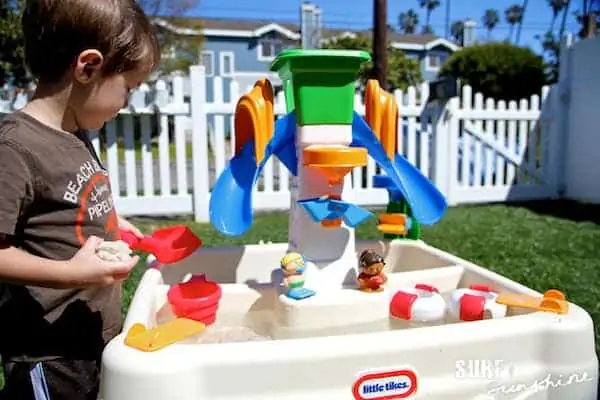 Living so close to the beach, I have this crazy ongoing notion that my son doesn’t need outdoor toys. We live in beautiful southern California and all we have to do is walk a couple blocks down the street and we’re at the beach. In an ideal world where I have time to spend hours at the beach every day, this “idea” would work out just perfectly fine. Unfortunately, I rarely have time to even leave the house, much less spend play days at the beach. So when I spotted the Little Tikes Sandy Lagoon Waterpark online, I just *knew* I Whistler needed it.