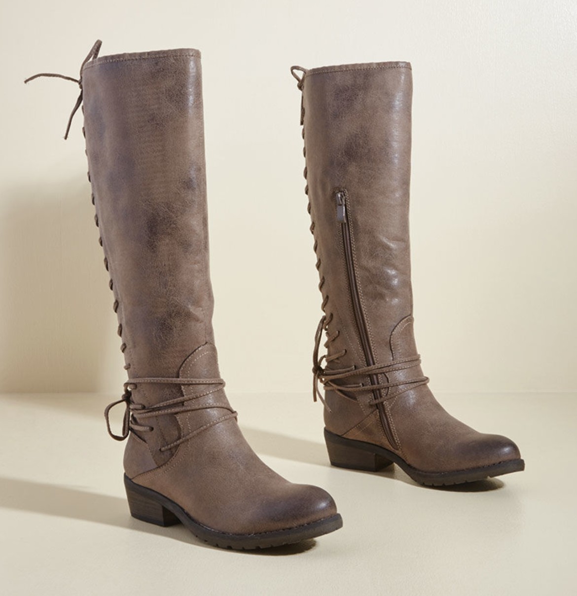What’s not to love about these knee high riding boots with adorable back laces (and inner zippers for convenience)? Plus, the versatile taupe tone pairs well with our fall wardrobe.